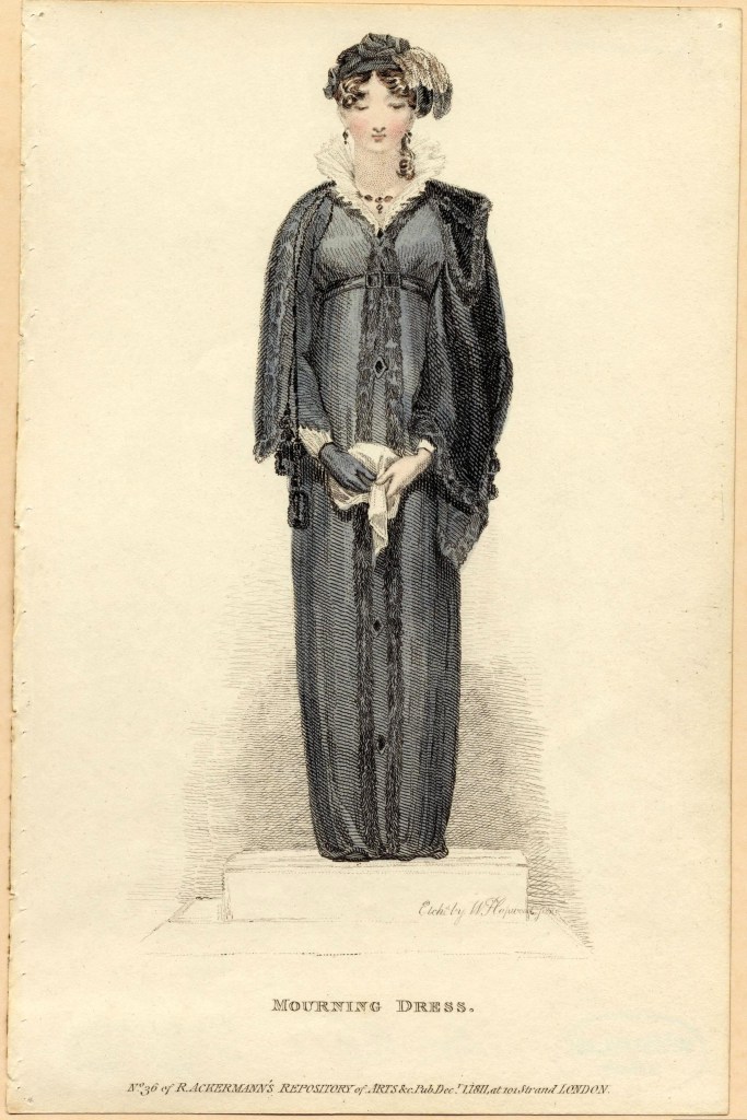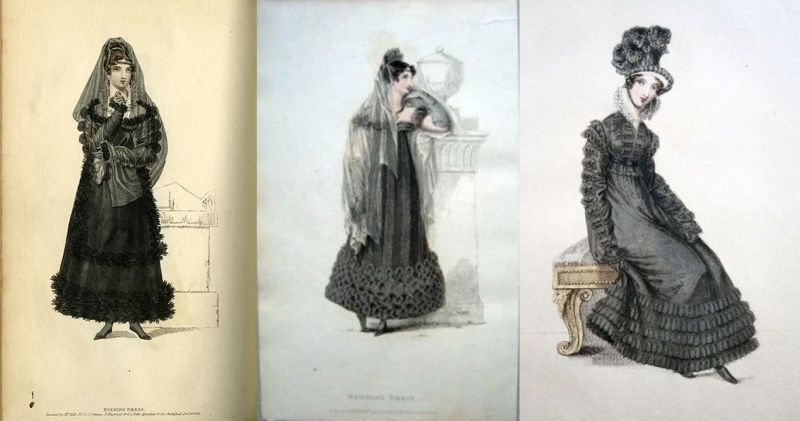 Regency fashion plates, such as those from Ackermann’s Repository, include some quite elaborate mourning gowns. Take a look at flounces and furbelows on these:
