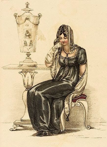I can’t imagine Elizabeth being quite as demure as this young widow, and she will certainly protest at the imposition of a widow’s cap, but I think I’ll allow her a dress this pretty and becoming. It’s rather better than the flounces and furbelows of most of the Ackermann fashion plates, and closer, I suspect, to Elizabeth’s restrained style.